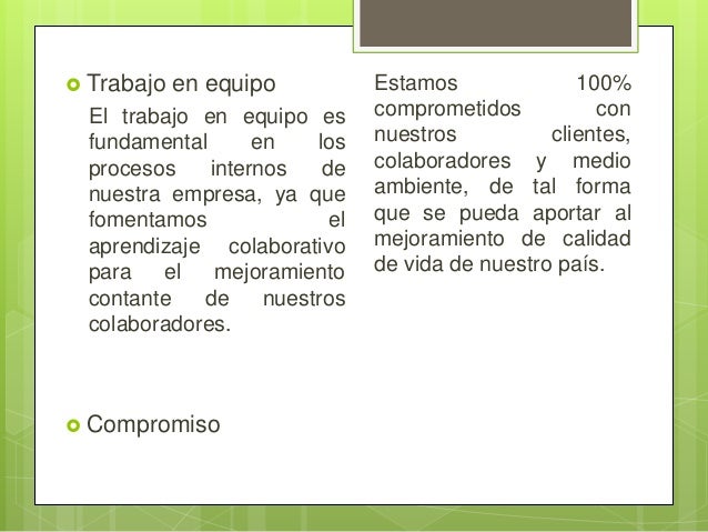 4.   Trabajo en equipo El trabajo en equipo es fundamental en los procesos internos de nuestra empresa, ya que fomentamos el aprendizaje colaborativo para el mejoramiento contante de nuestros colaboradores.  Compromiso Estamos 100% comprometidos con nuestros clientes, colaboradores y medio ambiente, de tal forma que se pueda aportar al mejoramiento de calidad de vida de nuestro país.